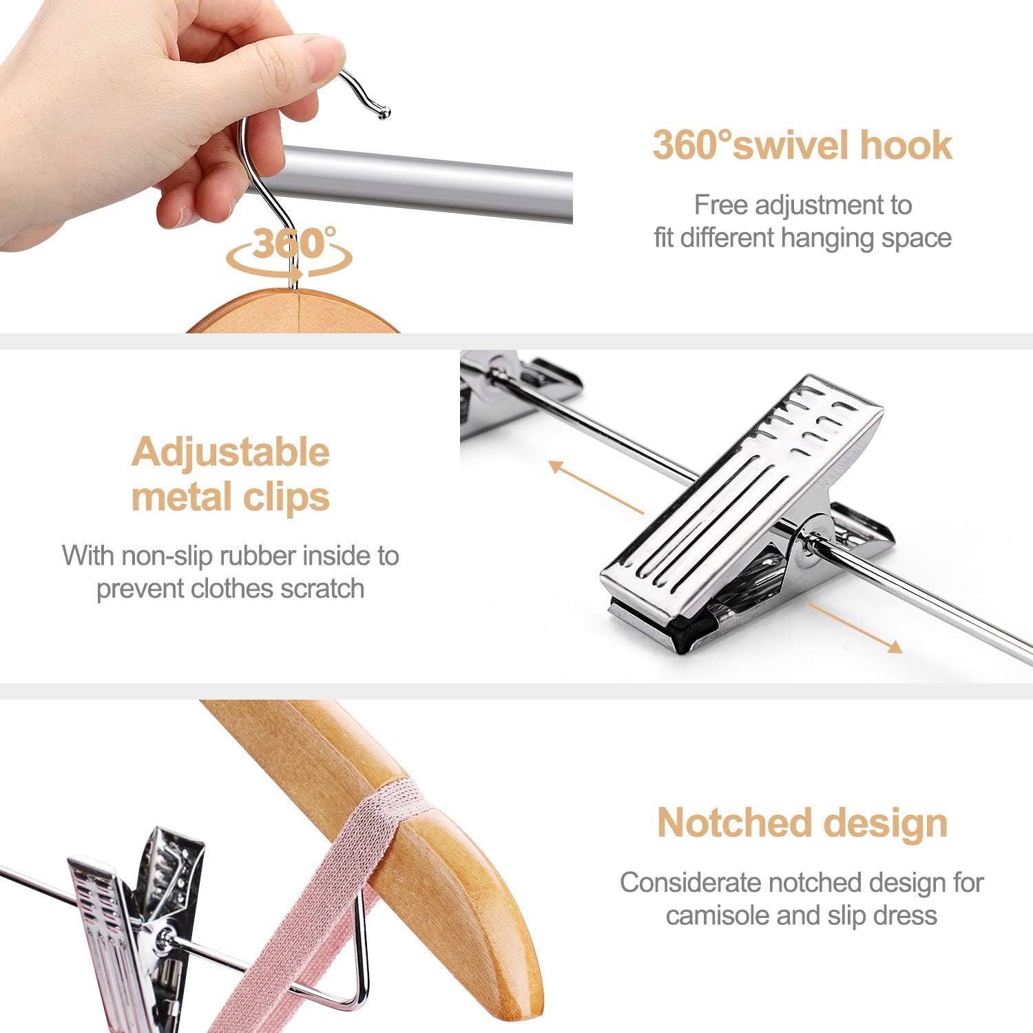 • ☘ Multifunctional & Space Saving Hangers- The shoulder line on the wooden hanger is contoured to help preserve clothes shape. There are grooves on each shoulder be used to hang your tank tops, dress, bars, ties, belts, nightgowns,shawls, skirts overalls tightly without slip. What's even more surprising is that we have additionally added two removable metal clips to hang pants of various sizes for you, further saving space in the clothset.