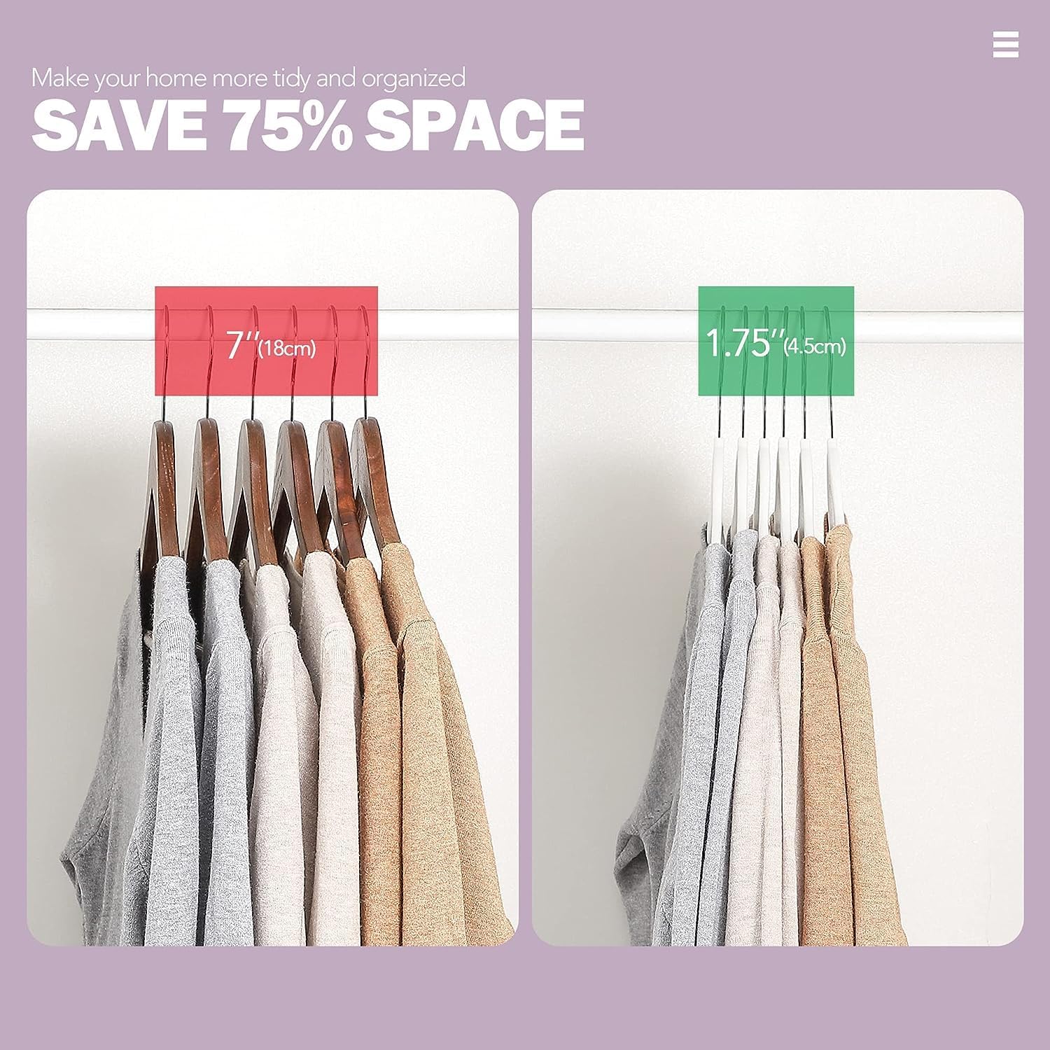 - Space Saving: The ultra-thin design with an optimal size of 17.5"L x 1/4"W x 9"H each hanger maximizes the storage space and makes full use of your wardrobe and room to make it clutter-free. Increases closet space by up to 50 percent. A galvanized metal hook with a 360-degree swivel meets your different hanging angle needs, good for easy clothing sorting, a perfect combination.